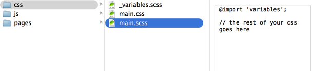 Partials will help you keep your mixins and variables in one place. A partial is a snippet of SCSS that gets included before a file is compiled. To mark a SCSS file as a partial, give it a name starting with an underscore, such as _variables.scss . Then, to include it in your main file, write @import 'variables' at the beginning of the document. That partial will not get processed into CSS.